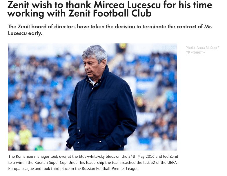 ”Conducerea lui Zenit a luat decizia de a-i termina contractul domnului Lucescu. Zenit ii multumeste domnului Lucescu si staff-ului sau pentru eforturile sale. Ii uram domnului Lucescu toate cele bune in cariera sa”, a fost anuntul rusilor.