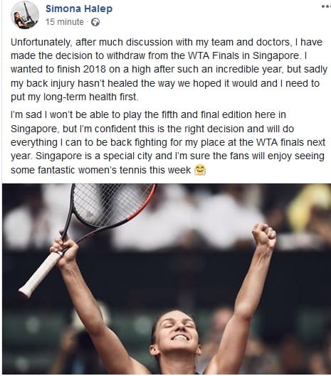 BREAKING NEWS: Simona Halep s-a retras de la Turneul Campioanelor!