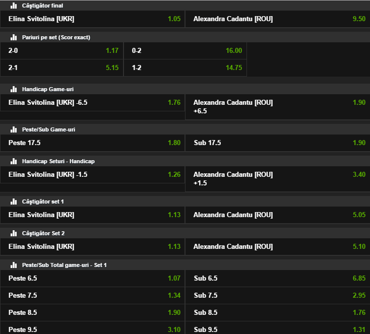 Partida dintre Alexandra Cadantu si Elina Svitolina va avea loc joi, de la ora 19:00 si va putea fi urmarita in direct pe DigiSport 2. NetBet ofera o cota imensa pentru o posibila surpriza provocata de Alexandra, 9.50, in timp ce victoria Svitolinei primeste o cota de doar 1.05.