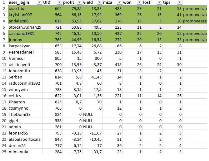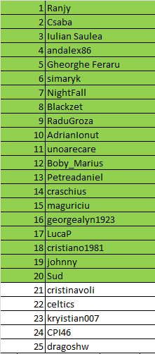 Dupa validarea tipsterilor care pot participa la tombola, conform regulamentului , am obinut o lista de 25 de persoane care se califica pentru acest tip de premiu.  Mai jos aveti ordinea de extragere a celor 25 de persoane. (pentru extragere s-a folosit ordonare random din excel folosind functia Rand() ). La fel, toti din aceasta lista sunt rugati sa adauge la profilul lor userii personali de la casele de pariuri din concurs pana duminica cel tarziu (vezi profil sectiunea conturi online) , altfel riscati sa nu intrati  in posesia premiului.  In cazul in care un tipster  din primii 20 din lista de mai jos nu indeplineste conditiile de acordare a acestui tip de premiu, atunci se va incerca validarea tipsterului de pe pozitia 21, samd.