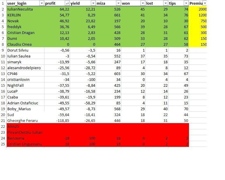 Doar 7 locuri au fost validate pentru a fi premiate, restul terminand pe negativ. In zilele urmatoare se va face validarea userilor de la casele de pariuri de la profilul vostru, pentru a stabili  cuantumul final al premiilor.  Daca nu v-ati adaugat pana acum userul la Profil in sectiunea de conturi online, aveti timp sa o faceti pana cel tarziu duminica seara. In cazul in care userul nu va fi adaugat pana atunci, riscati sa nu intrati in posesia premiilor.  (vedeti regulament pentru mai multe detalii). La inceputul saptamanii viitoare, castigatorii vor fi contactati pentru a fi informati in legatura cu rezultatul validarii si despre cuantumul final al premiilor (nu uitati faptul ca premiile afisate pot fi reduse – vedeti regulament). Premiile vor fi virate direct in conturile voastre de pariuri in functie de sponsor.