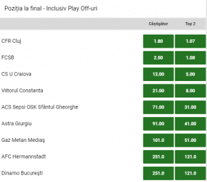 Desi CS „U” Craiova se afla la doar doua lungimi distanta in spatele FCSB-ului, oltenii nu sunt luati deloc in serios in ceea ce priveste lupta la titlu. Elevii lui Mangia primesc o cota uriasa, de 12.00 din partea celor de la Unibet pentru a cuceri titlul. „Ros-albastrii” sunt, evident, cotati cu sansa a doua, cu 2.50, in timp ce liderul CFR are o cota de 1.80. Cu toate acestea, situatia s-ar putea schimba radical, avand la dispozitie cinci etape din sezonul regulat si un intreg play-off in fata. La punctajul actual pe care-l au CFR Cluj si FCSB, 46, respectiv 43, acestea ar urma sa fie despartite de un singur punct dupa injumatatirea acestora, o distanta infima, deci, si total recuperabila in lupta la titlu. Ramane de vazut daca jocul „ros-albastrilor” se va schimba odata cu venirea lui Mihai Teja la carma echipei. Pe de alta parte, CFR Cluj a inregistrat evolutii constante pe intreg parcursul acestui sezon si a demonstrat atat de bine acest fapt prin succesul din meciul direct, chiar din etapa precedenta, scor 2-0 pe „Arena Nationala”. Cu toate acestea, exista in continuare zvonuri care alimenteaza o posibila plecare a golgheter-ului ardelenilor, George Tucudean, in cazul in care gruparea din Gruia ar primi o oferta financiara favorabila.