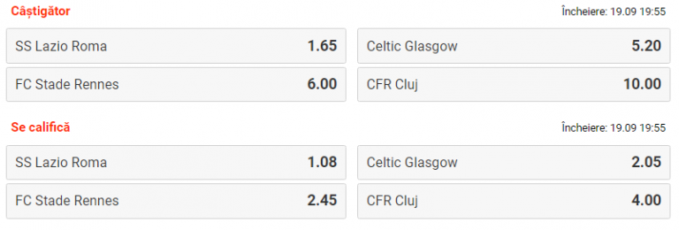 Favorită la câștigarea grupei E este Lazio cu o cotă de 1.65 urmată de Celtic Glasgow, cotată cu 5.20 și Rennes cu o cotă de 6.00.