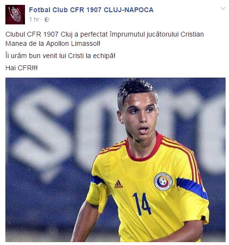 ”Clubul CFR 1907 Cluj a perfectat imprumutul jucatorului Cristian Manea de la Apollon Limassol! Ii uram bun venit lui Cristi la echipa! Hai CFR!!!”, au postat ardelenii.