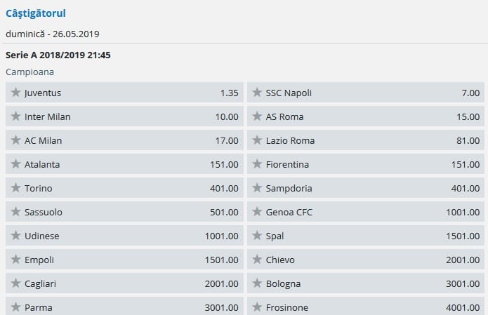 Cotele castigatorului Seria A in sezonul 2018-2019