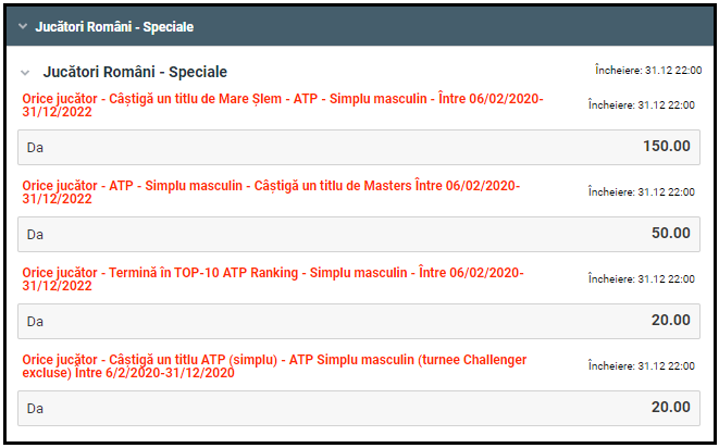In prezent, Romania nu are un reprezentant capabil sa se lupte pentru un titlu de grand slam la simplu. Totusi, cei care au incredere in jucatorii nostri in perioada 2020-2022, pot castiga de 150 de ori suma pariata.