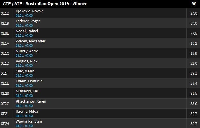 Jucatorul elvetian Roger Federer a castigat surprinzator, ultimele doua editii ale turneului de la Australian Open. In 2017 l-a invins pe Rafael Nadal, iar in sezonul precedent, elvetianul a dispus de croatul Marin Cilic. Liderul mondial Novak Djokovic este favoritul principal, cu o cota foarte mica la victorie, 2.30. Sarbul pare indestructibil, insa jucatori ca si Karen Khachanov sau Alexander Zverev au reusit sa il invinga in aceasta toamna. Spaniolul Rafael Nadal nu este inca la 100% din potentialul fizic si nu a mai evoluat in circuitul ATP de la US Open, cand a fost nevoit sa se retraga din semifinala cu Juan Martin Del Potro, datorita unei accidentari.
