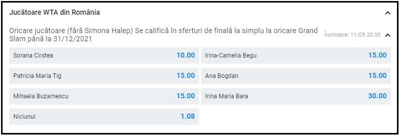 Betano ofera o cota de 10.00 pentru ca Sorana Cirstea sa ajunga intr-un sfert de finala la unul din urmatoarele sapte turnee de grand slam. Begu, Tig, Bogdan si Buzarnescu sunt urmatoarele patru, toate primind cote de 15.00, in timp ce Irina Bara (25 ani) primeste o cota de 30.00. Totusi, cei de la Betano nu sunt increzatori ca cel putin una dintre jucatoarele mentionate va reusi sa obtina acest rezultat pana la finalul anului 2021.