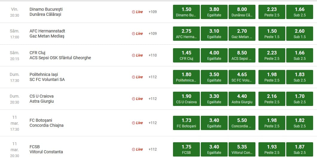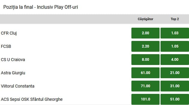 CSU Craiova a dezamagit in ultima etapa a sezonului regulat, fiind invinsa de Astra pe teren propriu, scor 1-2. Cele doua formatii vor relua disputa si duminica, iar giurgiuvenii tintesc o noua surpriza. Oltenii lui Devis Mangia au cota 8.00 pentru a-si adjudeca trofeul, dar daca vor ajunge in primele doua clasate, cota este „doar” 4.00. Nu in ultimul rand, „Cenusareasa” grupului, Sepsi Sf-Gheorghe, este cotata la 51.00 daca va termina in top 2, iar un improbabil succes, „livreaza” nebunia de cota 101.00.