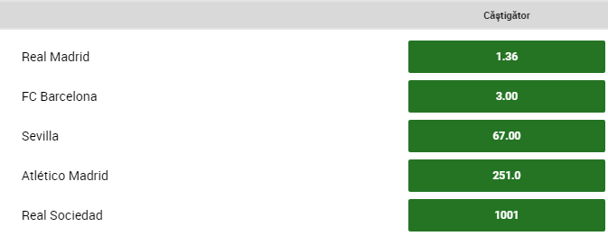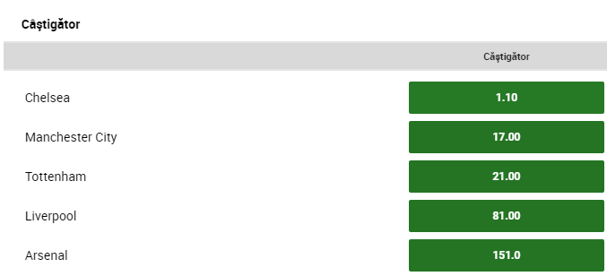 Chelsea a pornit ca din tun acest campionat si nu pare sa aiba de gand sa cedeze sefia Premier League pana la finalul acestei stagiuni. Gruparea londoneza functioneaza perfect in formula cu trei fundasi sub comanda lui Antonio Conte, fiind de altfel calificata si in semifinalele Cupei Angliei. Raportandu-ne strict la sansele la cucerirea campionatului, Chelsea primeste o cota infima de 1.10, in timp ce trupa lui Pep Guardiola, Manchester City, este principala contracandidata in opinia bookmakerilor, la o distanta cota de 17.00. Urmatoarele pe lista sunt Tottenham Hotspur si Liverpool, cu cote de 21.00, respectiv 81.00.