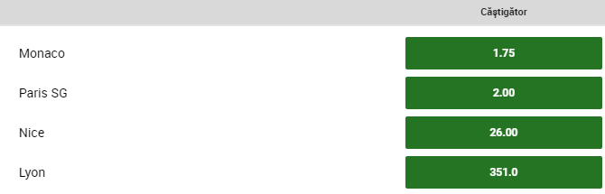 Desi bookmakerii par sa o ignore totalmente pe Nice, revelatia campionatului Frantei ce a poposit o sumedenie de etape pe primul loc in Ligue 1, baietii lui Favre se afla la cinci puncte de liderul AS Monaco, handicap, la urma urmei, recuperabil. In consecinta, cine crede ca OGC Nice va reusi totusi sa-si adjudece trofeul de campioana la finalul acestei stagiunii poate miza pe o imensa cota de 26.00 oferita de Unibet. Conform clasamentului insa, Monaco este cotata cu prima sansa (1.75), urmata din scurt de bogatii de la PSG (2.00).