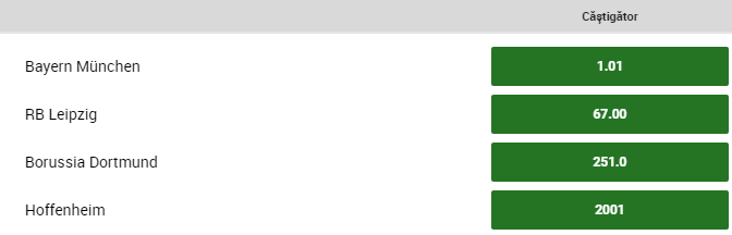 Indiferent de antrenorul care sta la carma echipei, Bayern Munchen are un lot extrem de valoros ce-i permite in continuare sa defileze in Bundesliga, de aceasta data sub comanda italianului Carlo Ancelotti. Dupa un tur de campionat cu emotii, in care revelatia Red Bull Leipzig si-a depus candidatura la titlu, bavarezii au turat motoarele la maximum, lasand in urma restul pretendentelor la titlu, incluzand-o aici si pe rivala Borussia Dortmund. In consecinta, cota nesemnificativa de 1.01 pe care Bayern o are pentru a castiga din nou campionatul in Germania nu reflecta decat superioritatea incontestabila bavarezilor intr-o ierarhie inferioara acestora.
