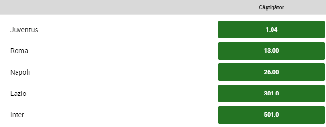 Juventus Torino se indreapta incet, dar sigur, catre cel de-al saselea titlu consecutiv in Serie A. Baietii lui Allegri au inregistrat cativa pasi gresiti in deplasare, insuficienti insa pentru a fi ajunsi din urma de catre principalele contracandidate AS Roma si Napoli. La urma urmei, Juve a castigat 15 victorii din tot atatea posibile pe propriul teren, astfel ca pozitia ocupata in ierarhie inca de la inceputul sezonului este una cu adevarat meritorie. Chiar si primind o cota de 1.04 la castigarea trofeului in Italia, “bianconerii” mai au cateva deplasari grele, precum cele de la Napoli si AS Roma, astfel ca, cine doreste sa mizeze pe o eventuala revenire spectaculoasa a Romei in clasament, primeste o cota mai mult decat tentanta: 12.00!