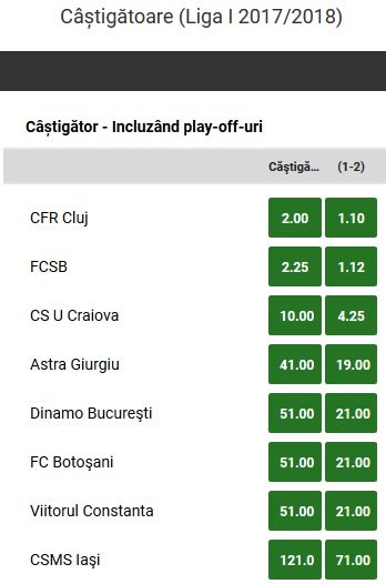 CFR Cluj a impresionat intreg campionatul romanesc, echipa incropita in vara de catre Dan Petrescu etaland un joc de o calitate cu mult peste marea majoritate a formatiilor din Liga 1, pozitia de lider in pauza de iarna fiindu-i justificata. Astfel, Unibet ofera o cota de 2.00 pentru ca titlul sa mearga in Ardeal. De cealalta parte, FCSB si valoarea propiu-zisa a echipei lui Nicolae Dica o propulseaza pe aceasta in imediata apropiere in vederea cotelor oferite pentru castigarea titlului in campionatul romanesc, cota „ros-albastrilor” fiind listata la 2.25.