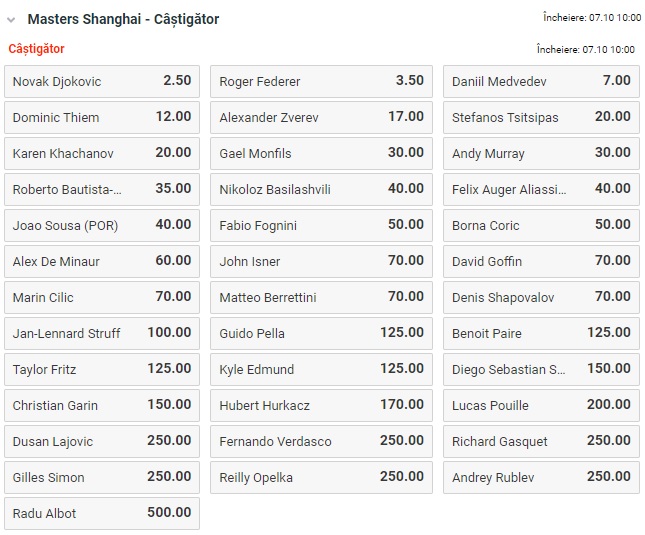 Rafael Nadal si-a anuntat retragerea de la Shanghai Masters, insa competitia de 1000 puncte nu duce lipsa de staruri. Novak Djokovic, 4 titluri castigate aici, Roger Federer, cu doua trofee, dar si lupii tineri Daniil Medvedev sau Alexander Zverev, sunt prezenti pe tablou principal de concurs. Djokovic este cotat cu 2.50 sa isi adjudece al cincilea trofeu, iar Federer are cota 3.50 pentru „hattrick”. Pentru profit major, Medvedev, finalist la US Open in acest sezon, are cota 7.00 sa castige al doilea titlu Masters 1000 al carierei, dupa Cincinnati. Intra pe site-ul casei de pariuri Betano, categoria Castigatori Competitie (sectiunea tenis) si pune-ti banii pe starurile tenisului mondial!