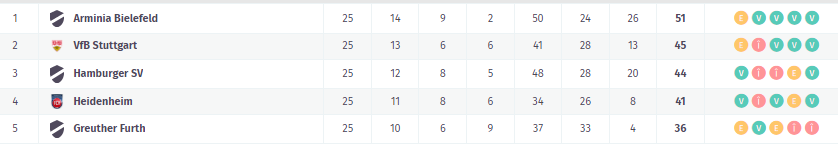 In weekend, dintre trupele nominalizate, cel mai simplu meci pare a-l avea chiar liderul. Arminia primeste vizita lui Osnabruck, locul 12 al ierarhiei. Stuttgart joaca la Wehen, formatia care a castigat in tur, pe terenul ”svabilor”, scor 2-1, in timp ce Hamburg merge la o alta trupa cu pretentii a stagiunii, Greuther Furth. Heindenheim are meci la Bochum, trupa ce a incheiat la egalitate 10 din cele 25 de meciuri ale campionatului in curs.