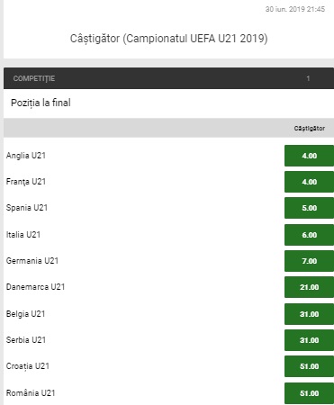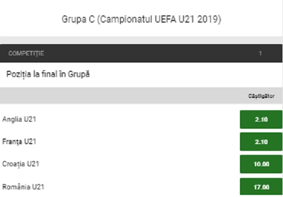 Bookmakerii nu o vad nici pe departe favorita pe formantia noastra, Romaniei fiindu-i atribuita o cota de 17.00 pentru castigarea grupei. Favoritele grupei sunt Franta si Anglia, aceastea fiind listate la o cota de 2.10, in vreme ce victoria Croatiei primeste o cota de 10.00. De asemenea, un potential succes istoric al Romaniei la Euro 2019 primeste o cota de 51.00 la Unibet.