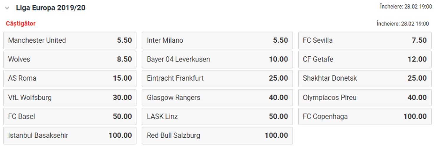 Imediat dupa deznodamantul „dublelor” din cadrul saisprezecimilor de finala, bookmakerii s-au mobilizat si au oferit piete pentru castigatoare competitiei. La Betano, Manchester United si Inter Milano sunt cotate cu prima sansa in vederea adjudecarii trofeului, cota pentru triumful acestora fiind listata la 5.50. In continuare, FC Sevilla completeaza podiumul favoritelor – cota 7.50, aceasta fiind urmata de Wolverhampton – cota 8.50 si Bayer Leverkusen – cota 10.00.