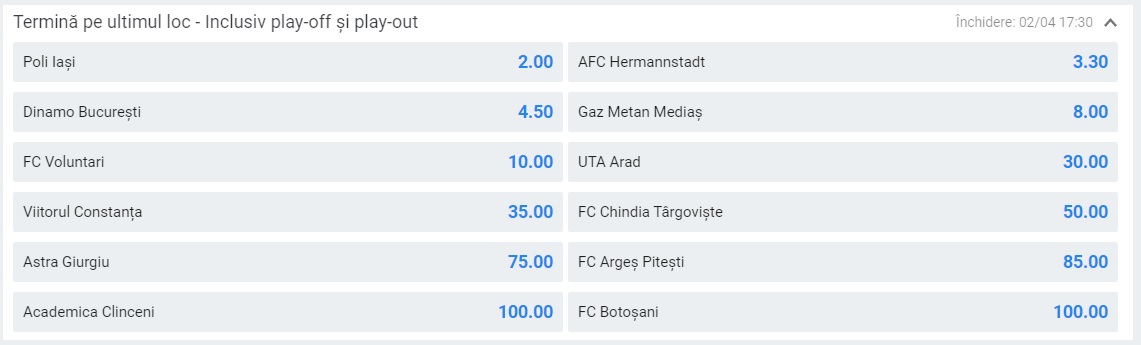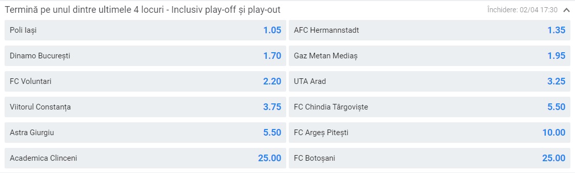 La Betano, tu faci jocul si pariezi pe echipele tale favorite. Poti miza pe cine crezi ca va termina pe  unul dintre ultimele 3 locuri, selectie unde Dinamo are cota 1.70, de exemplu, dar si pe ultima clasata la finalul sezonului. Si aici, Poli Iasi este favorita dupa evolutiile catastrofale din sezonul regulat si a primit cota 2.00 din partea agentiei. Intra pe Betano la categoria Pariurilor Speciale din Liga 1 si consulta toata oferta disponibila, pentru a plasa cele mai inspirate pariuri!