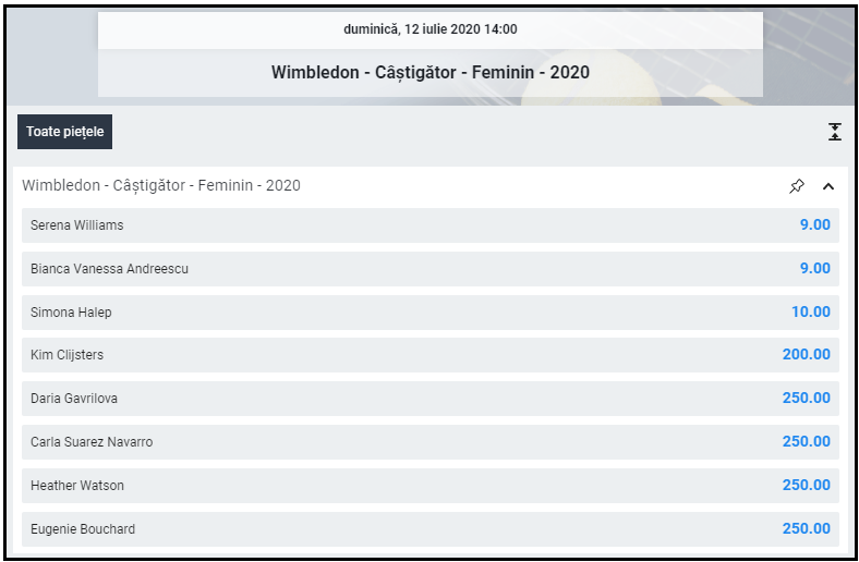 In ciuda rezultatului din 2014, Bouchard primeste ultima sansa la castigarea titlului la editia din 2020. Canadianca primeste o cota de 250.00 la Betano pentru a se impune in proba de simplu la Wimbledon 2020, turneu care ar trebui sa inceapa pe data de 12 iulie si la care Simona Halep este campioana en-titre.