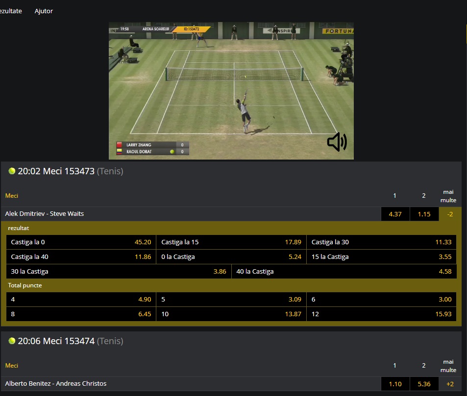 Jocul propus de Fortuna dureaza doar cateva minute si consta in parierea pe deznodamantul unui singur game. Drept urmare, pe site poti sa pariezi pe invingatorul partidei virtuale, dar si pe scorul corect din game sau pe numarul de puncte! Spre exemplu, un pariu pe un game decis dupa „deuce” are cote de la 6.45 in sus, indiferent de partida.