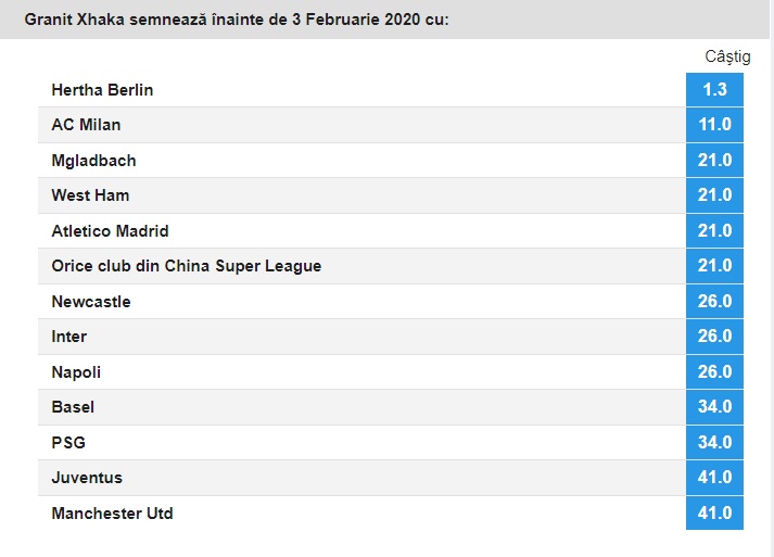 Agentul lui Xhaka, Jose Noguera, anunta insa ca s-a ajuns la un acord cu Hertha Berlin pentru transferul mijlocasului, iar acesta isi doreste sa plece de la Londra. Sefii lui Arsenal, inclusiv Edu si Arteta au fost informati, iar singurul lucru ce lipseste este acordul cluburilor privind suma de transfer. Este de asteptat ca Xhaka sa semneze cu gruparea antrenata de Jurgen Klinsmann pana in 3 februarie 2020, pariu special pe care putem miza la casa de pariuri Betfair.