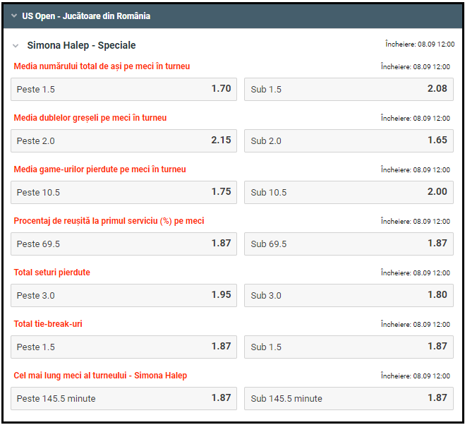 Cota de 1.95 oferita de Betano pentru minim 4 seturi cedate de Halep la US Open 2019 pare una extrem de atractiva. Daca reprezentanta noastra va ceda doar 3 seturi, miza va fi returnata.