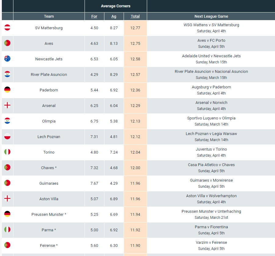 Granzii din Europa nu au loc pe lista! Prima echipa „mare” prezenta in Top 10 este Arsenal, pe locul 6 la acest capitol, cu o medie de 6,25 cornere pe meci executate si 6,04 cedate. Surprinde, oarecum, prezenta in top a mai multor formatii din primele doua ligi portugheze. Spre exemplu, in meciurile lui Aves se executa, in medie, 12.75 cornere, in timp ce Chaves, Guimarares si Feirense beneficiaza, in mod normal, de 5 sau 6 cornere meci de meci. Poti sa deschizi AICI cont la 888Sport, pentru a paria pe lovituri de colt.