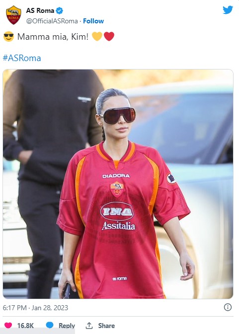 În trecut, în ianuarie, Kardashian a fost fotografiată purtând un tricou clasic al lui Roma din sezonul 1997-1998 în Los Angeles, iar administratorul contului de Twitter al clubului din Serie A a remarcat alegerea ei vestimentară.