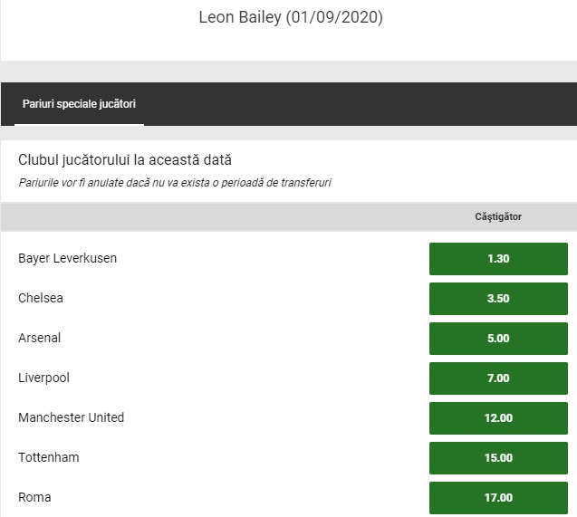 Daca Leon Bailey va fi jucatorul lui Liverpool pe 1 septembrie 2020, cota oferita de agentia Unibet este 7.00. Alte grupari interesate de jamaican sunt Chelsea (cota 3.50 pentru un transfer) sau Arsenal (cota 5.00). In cazul in care Bailey va ramane si dupa aceasta perioada la Bayer Leverkusen, Unibet propune cota 1.30! Intra pe site-ul agentiei si consulta toate selectiile de mizat, la categoria pariuri speciale!