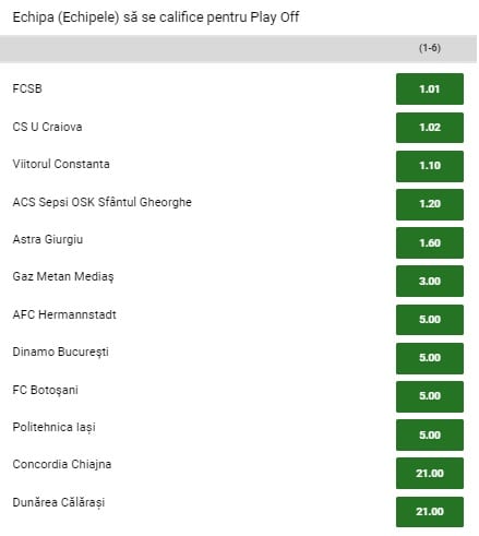 Bookmakerii Unibet sunt convinsi de faptul ca actualele ocupante ale locurilor 4-5, nu vor rata prezenta in play-off. Viitorul are cota 1.10, putin mai scazuta decat cea a trupei din Sf.Gheorghe. Raportat strict la cotatii, locul 6 va fi acela pentru care se vor lupta nu mai putin de 6 echipe. Astra este favorita – cota 1.60 – Gaz Metan, Hermannstadt, FC Botosani, Poli Iasi si Dinamo, primind aceeasi cota de 5.00. Suprinde includerea ”cainilor” in acest grupa de formatii cu sanse la un finiș in top 6, in conditiile in care trupa lui Rednic, a 11-a clasata, are o sarcina aproape imposibila in rundele finale ale sezonului regulat: recuperarea ecartului de 9 puncte care o separa de Astra.