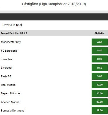 Manchester City este in continuare principala favorita in vederea castigarii Ligii Campionilor. „Cetatenii” condusi de Pep Guardiola primesc o cota de 4.50 la Unibet. Principala rivala a britanicilor este FC Barcelona – cota 5.50. In continuare, le regasim in ordine pe Juventus – cota 8.00, Liverpool – cota 8.50 si PSG – cota 9.00. De asemenea, mentionam faptul ca un potential nou al celor de la Real Madrid este cotat cu 12.00.