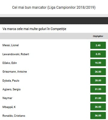 Lupta pentru titlul de golgheter al celei mai importante competitii intercluburi se va da, conform bookmakerilor, intre Lionel Messi – cota 2.10 si Robert Lewandowski – cota 3.25. Edin Dzeko – cota 16.00 completeaza”podiumul favoritilor”, in vreme ce Cristiano Ronaldo – cota 36.00 are doar sanse teoretice.