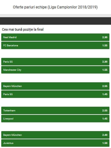 In alta ordine de idei, Unibet ne ofera o gama extrem de variata de pariuri. Alaturi de cotele prezentate mai sus, echipa noastra va indeamna sa va orientati atentia si catre alte optiuni, precum cele de mai jos. Puteti miza pe pozitia finala a formatiilor. Spre exemplu, daca Real Madrid va fi eliminata mai tarziu in competitie decat FC Barcelona puteti miza pe o cota 2.30.
