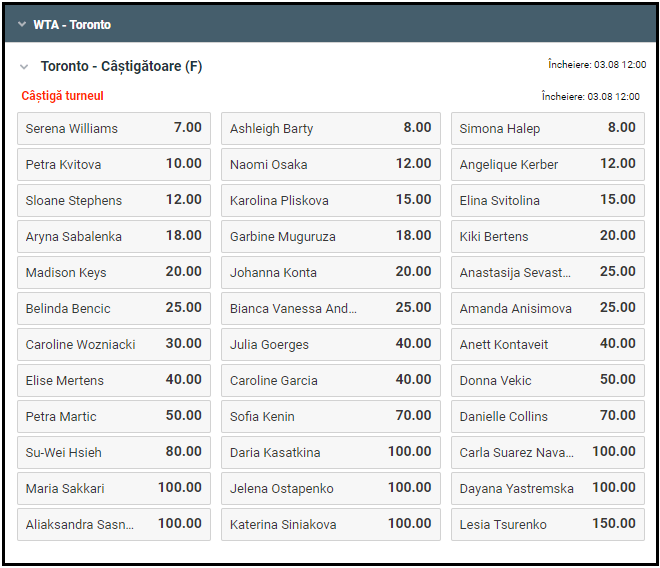 Serena Williams este principala favorita a bookmaker-ilor la Toronto, in timp ce Simona Halep si Ashleigh Barty, campioanele de la Wimbledon, respectiv Roland Garros, primesc cote identice la Betano, 8.00.