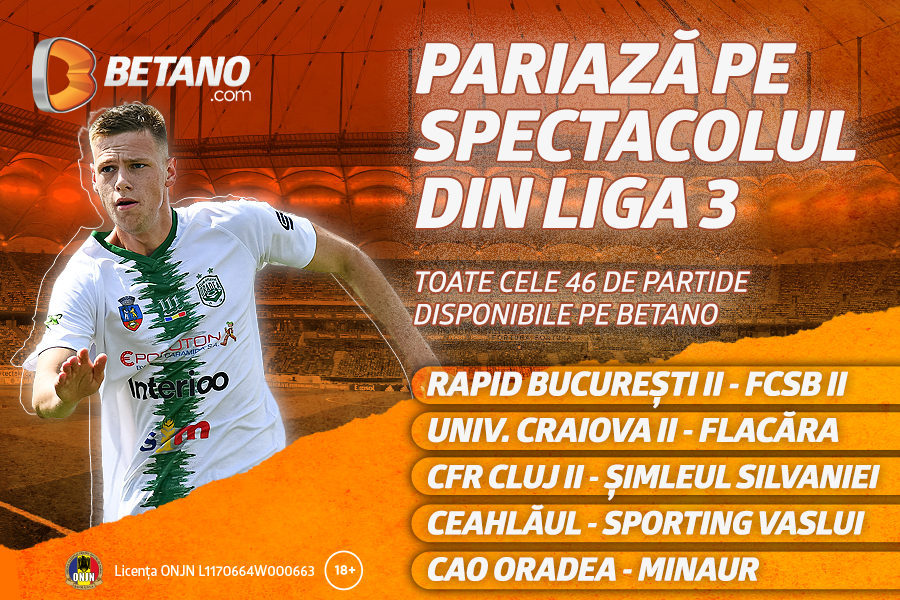 Nu mai puțin de 46 de partide se vor disputa în toate cele zece serii ale Ligii a 3-a în acest sfârșit de săptămână. Bătălia pentru promovare în al doilea eșalon se trăiește la Cote Maxime cu BetCombo (pre-meci și LIVE), zeci de opțiuni de pariere pe meci și retrageri în maximum 3 ore pe Betano!