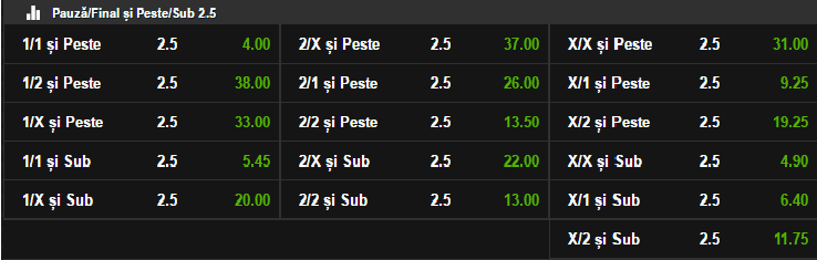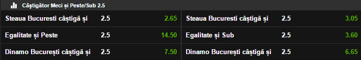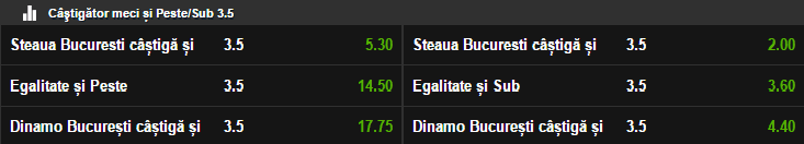 In ceea ce priveste pariurile speciale, victoria la 0 a Stelei e cotata la 2.65, iar cea a dinamovistilor la 6.70. Castigarea uneia dintre reprize va poate aduce profit. La acest capitol, cota gazdelor este 1.41, iar cea a oaspetilor de 2.65. Daca simtiti ca ambele echipe marcheaza si vom vedea peste 2.5 reusite, puteti miza pe o cota de 2.65. Alte variante propuse de NetBet sunt urmatoarele: