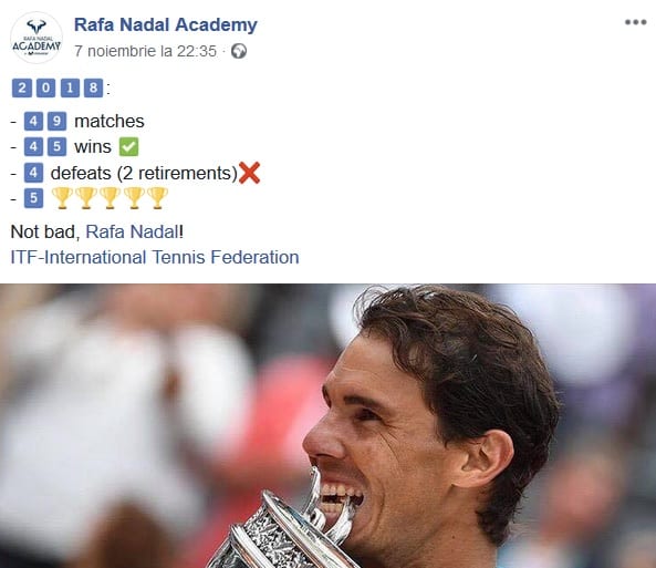 Fostul lider mondial Rafael Nadal a castigat 45 din cele 49 de partide disputate in 2018.