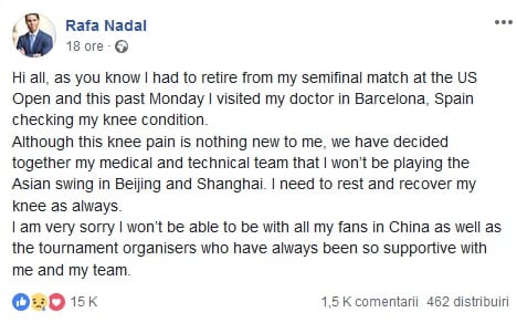 Liderul mondial a postat un mesaj pe pagina sa oficiala de Facebook in care explica faptul ca are nevoie de odihna si recuperare la genunchiul care i-a pus probleme la US Open. Spaniolul a trebuit sa se retraga in semifinala cu Del Potro dupa primele doua seturi disputate. In sezonul trecut, Nadal a castigat trofeul la Beijing, iar la Mastersul de la Shanghai a pierdut finala in fata lui Roger Federer, intr-o partida in care din nou a avut probleme la genunchi. Jucatorul spaniol pierde astfel puncte pretioase in lupta cu Federer si Djokovic pentru titlul de numarul 1 mondial la sfarsitul sezonului. Nadal ar urma sa mai participe la Mastersul de la Paris si la Turneul Campionilor de la Londra, asta daca nu va solicita un wild-card la Viena, competitie unde s-a zvonit ca ar dori sa participe, expirandu-i contractul cu Basel.