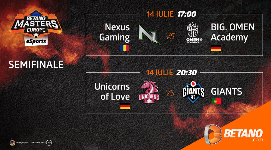 În partea opusă a tabloului, de la 20:30 e semifinala germano-portugheză dintre Unicorns of Love și Giants Gaming. Conform cotelor, meciul este mult mai echilibrat, cu 2.00 pentru germanii de la Unicorns și 1.75 pentru Giants. Ambele au avut ca adversar echipa de jucători români fără contract, L4Org, care a ajuns până în sferturile de finală.