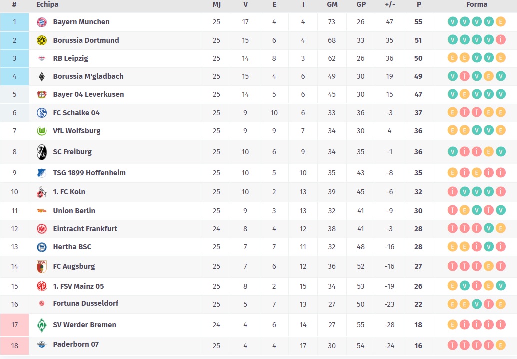 Bayern avea la inceputul returului o cota de 1.45 pentru a castiga Bundesliga, chiar daca nu se afla pe primul loc. Acum, cu 4 puncte avans fata de locul 2 ocupat de Dortmund, gruparea antrenata de Hansi Flick e cotata cu 1.25. Chiar daca „galben-negrii” au un avantaj de 1 punct fata de Leipzig, diferenta de cote e considerabila (Dortmund e cotata cu 6.00, iar „Taurii” au primit 10.00). Monchengladbach e la 1 punct de Leipzig, insa elevii lui Marco Rose si-au demonstrat calitatea in acest sezon. Astfel, „Manjii” au primit cota 75.00 in acest moment, pentru a deveni campionii Germaniei. In cele din urma, echipe ca Leverkusen, Wolfsburg, Schalke sau Hoffenheim, vor lupta pentru locurile de Europa League, iar cotele lor la titlu sunt uriase.