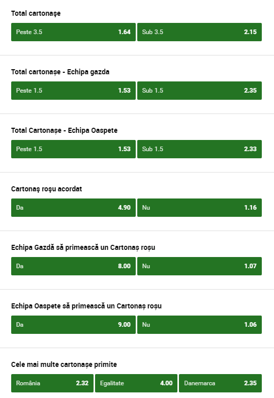 La urma urmei, formula de start pe care o va afisa selectionerul Cristoph Daum va influenta mult aspectul jocului cu danezii. Daca, intr-adevar, Romania va incepe cu acel 3-4-1-2, exista sanse bune ca, purtati si de un public extraordinar, “tricolorii” sa aglomereze zona mediana a terenului si sa-si faca jocul inca din primele minute ale partidei. De partea cealalta, situatia va fi una oarecum dificila pentru oaspeti, avand in vedere solutiile ofensive limitate la care va trebui sa apeleze tehnicianul Age Harelde. In concluzie, Unibet ne propune o varianta de pariere la cota 2.35 ce presupune ca Danemarca sa primeasca mai multe cartonase decat echipa Romaniei, scenariu complet realizabil, de altfel. La polul opus, “tricolorii” primesc o cota similara de 2.32, in timp ce un numar egal de cartonase obtinut de catre cele doua reprezentative are cota 4.00.