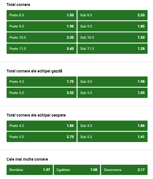 In conditiile in care niciuna dintre reprezentative nu ar fi multumita cu un rezultat de egalitate, ba mai mult decat atat, infrangerea echivaland cu un adevarat dezastru, exista asteptari pentru un joc deschis si relativ multe faze de poarta. In economia acestui scenariu, pariurile pe cornere sunt intotdeauna o varianta viabila, care ne-ar scapa de emotiile pronosticarii dificile a unui rezultat final corect. In consecinta, cota “tricolorilor” pentru a obtine cel putin cinci lovituri de la colt in jocul de la Cluj este una extrem de tentanta la 1.75.