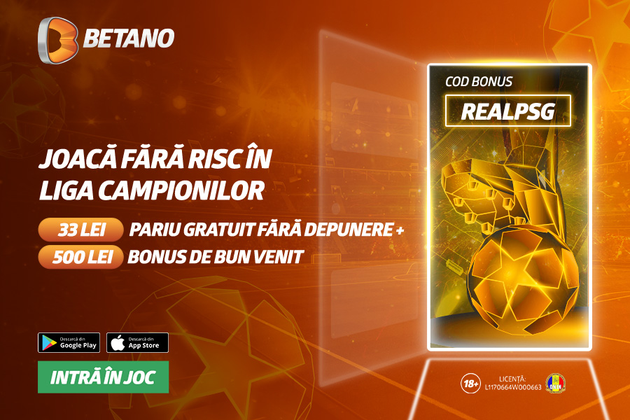 Atmosfera este una aparte așa că celebrăm Finala din Optimile Ligii cu o ofertă pentru toți utilizatorii noi! Te așteptăm să te înregistrezi acum pe Betano cu codul REALPSG, verifică-ți contul, iar noi îți oferim un Pariu Gratuit de 33 LEI fără depunere pentru meciul săptămânii în Europa!