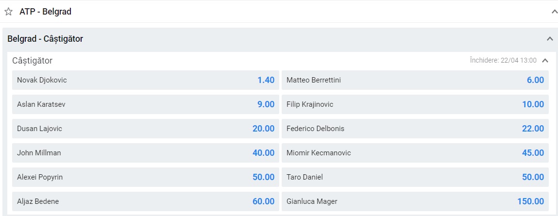 Vineri dupa-amiaza, Djokovic va evolua in sferturile de finala ale editiei din 2021 cu Miomir Kecmanovic, un sarb de 21 ani, in fata caruia nu ar trebui sa aiba mari probleme. Agentia Betano iti ofera acum cote pentru castigatorul de la Belgrad, iar Nole este cotat cu 1.40! Al doilea favorit este italianul Matteo Berrettini, cota 6.00, ce insa nu are mari rezultate pe zgura. Semifinalistul de la Australian Open, rusul Aslan Karatsev are cota 9.00, iar Filip Krajinovic, un alt sarb, este cotat cu 10.00. Pariaza acum la Betano pe favoritul tau si bifeaza profit!