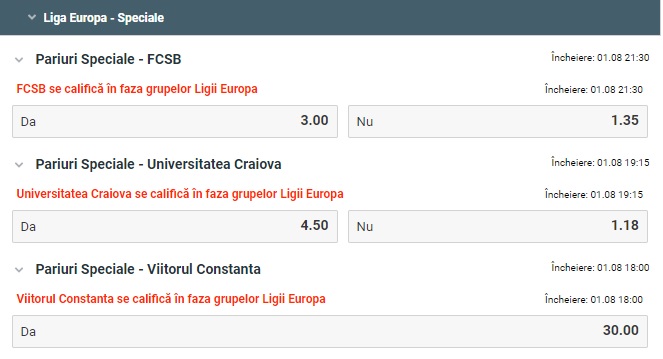 Consultand categoria de Pariuri Speciale a casei de pariuri Betano, investete-ti banii in calificarea gruparilor romanesti in grupele UEFA Europa League. Vei avea la dispozitie cotele 3.00, 4.50 si 30.00, numai bune pentru profitul scontat!