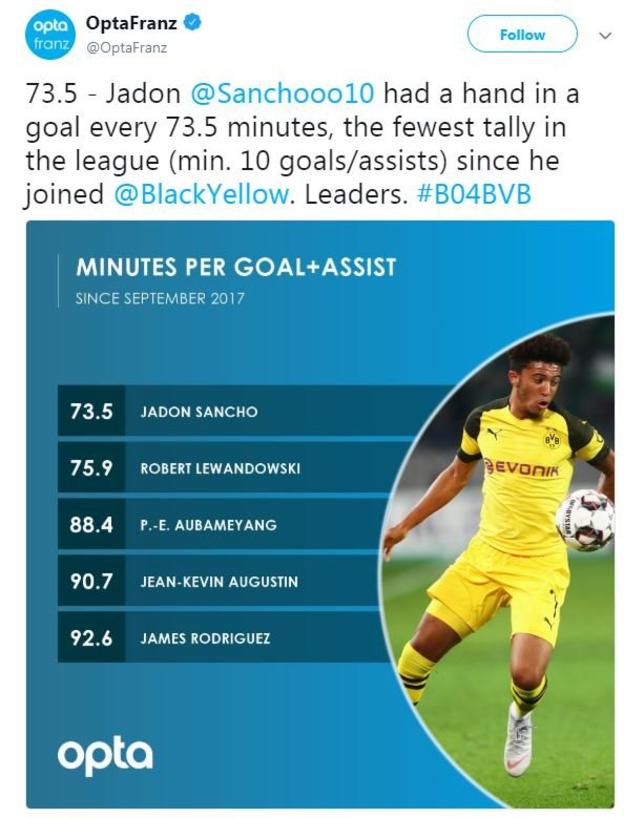 Mijlocasul de 18 ani a devenit cel mai bun pasator, cu 5 reusite, din primele 5 ligi ca valoare din Europa, in doar 124 minute de joc. Dortmund a fost condusa cu 2-0 de Leverkusen, insa golurile lui Larsen, Reus si Paco Alcacer (2) au dus Borussia pe primul loc in Bundesliga, depasind campioana Bayern Munchen. Sancho a fost transferat de la academia lui Manchester City in 2017, reusind sa marcheze 2 goluri in tricoul galben-negru.
