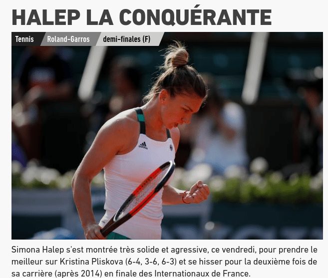 Halep a impresionat-o si pe adversara ei, Karolina Pliskova. Sportiva din Cehia a avut numai cuvinte de lauda la adresa romancei si spune ca si-ar paria toti banii pe Simona Halep, in finala de sambata. „Pariez tot ce am ca Simona va castiga finala. Cred ca as fi batut 99% dintre fete cu tenisul de azi, dar am avut ghinion sa joc cu Simona”, a declarat Pliskova, la finalul meciului. Francezii de la L’equipe au oferit o descriere perfecta pentru performanta Simonei Halep! „Halep CUCERITOAREA” au numit-o jurnalistii din Hexagon pe sportiva din Constanta.