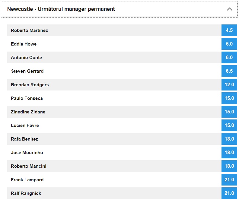 Primul in lista favoritilor la Betfair este insa Roberto Martinez, cotat cu 4.50. Spaniolul, actualul selectioner al Belgiei, ar fi dorit si de Barcelona pentru a-l inlocui pe Ronald Koeman. Martinez are experienta mare in Anglia, trecand pe la Swansea City, Wigan si Everton. In sezonul 2012/2013, ibericul a castigat cu Wigan Cupa Angliei, dupa o finala cu Manchester City. Cu sanse considerabile mai sunt numiti doi antrenori fara angajament. Eddie Howe, cota 5.00, este liber dupa ce a parasit-o pe Bournemouth in 2020, in urma unei „domnii” de 8 ani. De asemenea, italianul Antonio Conte, cota 6.50, n-a preluat vreun club dupa ce a castigat Serie A cu Inter Milano. Pariaza acum la Betfair pe favoritul tau si bifeaza profit!