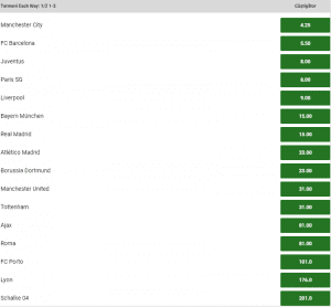 Aflata momentan pe locul 2 in Premier League, in spatele finalistei din sezonul trecut de UEFA Champions League, Liverpool, Manchester City este vazuta de catre bookmakeri drept principala favorita la castigarea trofeului UCL. Masinaria de goluri a lui Guardiola primeste cota 4.25, iar acest fapt nu reprezinta o surpriza. City continua sa inregistreze victorii pe banda rulanta si are parte de o misiune facila la prima vedere in optimi, urmand a da piept cu nemtii de la Schalke 04. Ca o paralela, duelurile de foc dintre Atletico – Juventus, Liverpool –  Bayern sau Manchester United – PSG vor  injumatati din start numarul de adversare periculoase pentru “cetateni” in drumul spre trofeu. Cea de-a doua favorita este Barcelona lui Valverde, care primeste cota 5.50. La randul lor, catalanii au parte de o dubla usoara, contra francezilor de la Lyon, iar Messi & Co. sunt decisi sa-si duca misiunea pana la capat, invatand din greselile din sezonul trecut, atunci cand au cazut prada naivitatii impotriva Romei, in sferturi.